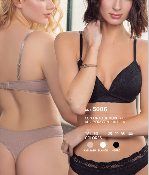 - Conjunto: Corpi de morley algodon y lycra con detalles en puntilla, contorno y breteles regulables + colaless a juego. Talles y colores a elección. Incluye caja exhibidora.