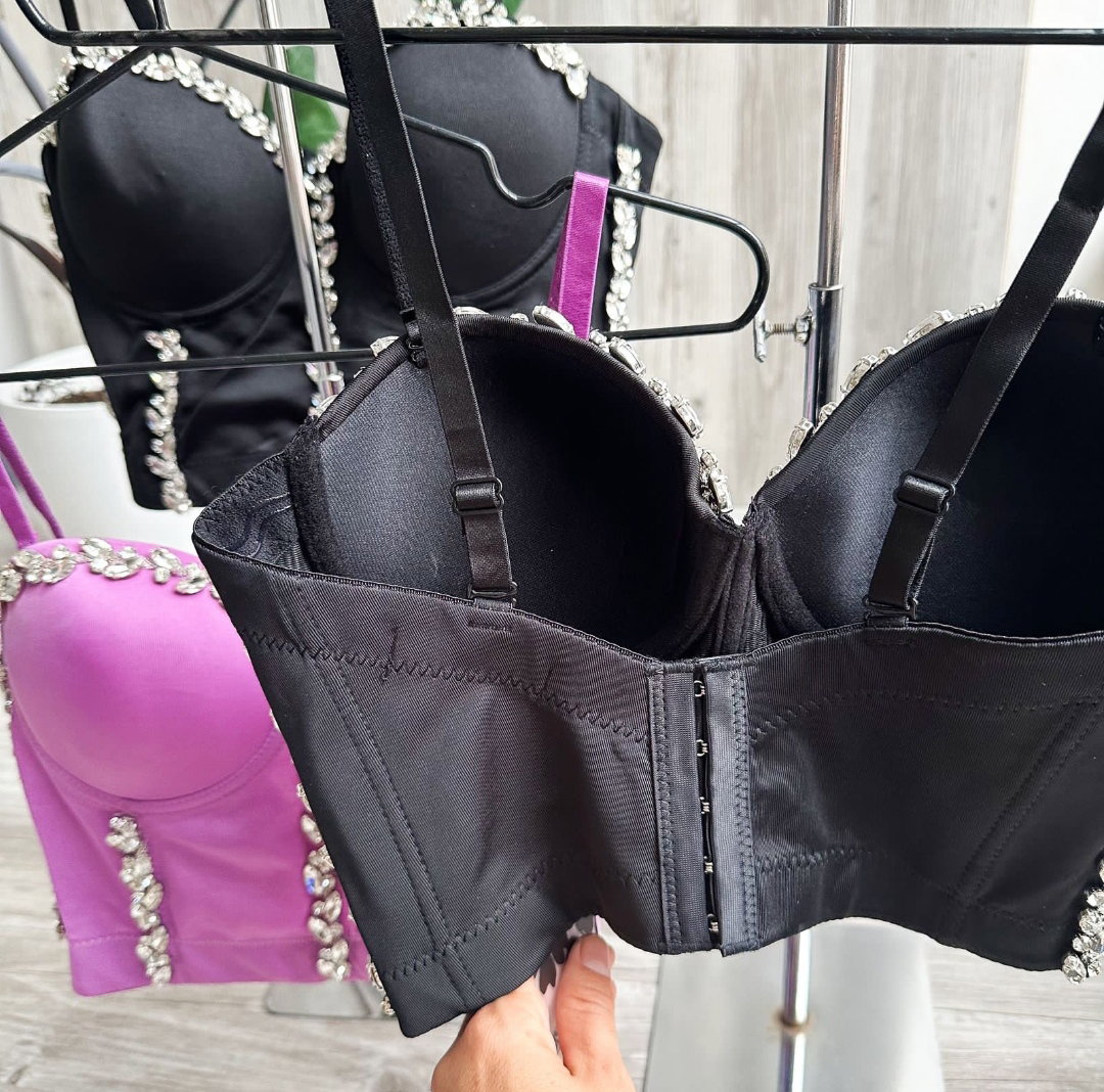 Corset importado con Gemas taza soft con aro, breteles desmontables y contorno regulable. Se puede usar straples. Color disponibles Lila /Negro