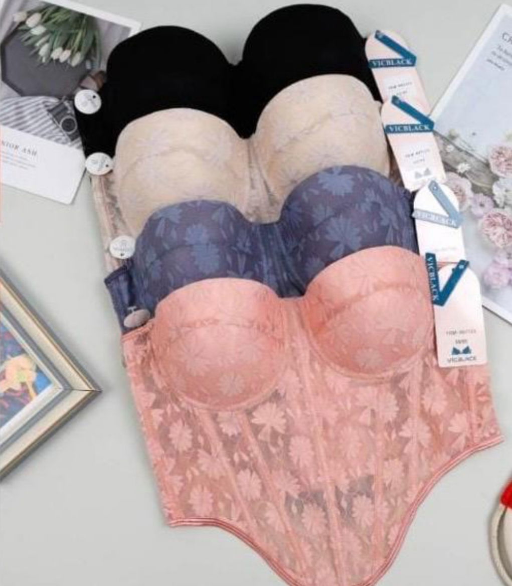 Nuevo corset importado de encaje elástico con varillas, breteles y contornos regulables. Talles surtidos (consultar). Colores: azulino- natural-durazno-negro
