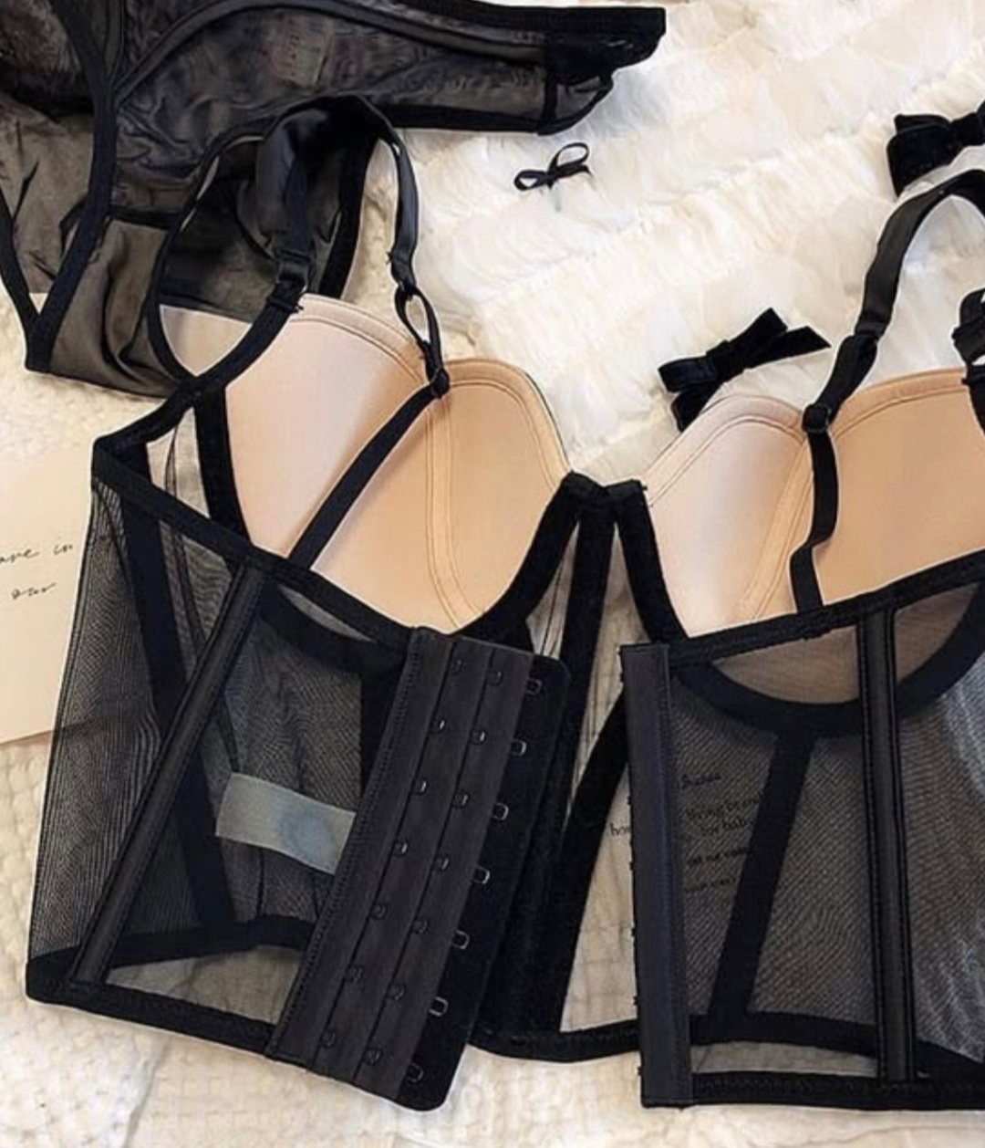 Set: Corset de microtul con aro y taza forrada, varillas, breteles anchos regulables y espalda regulable + Vedetina de tul -