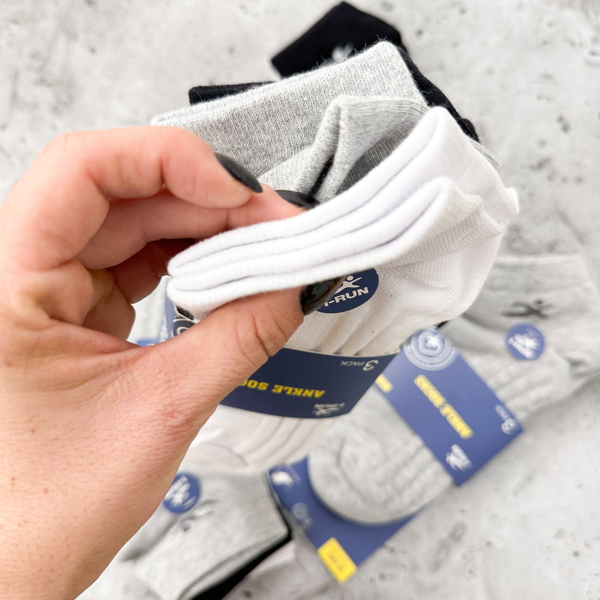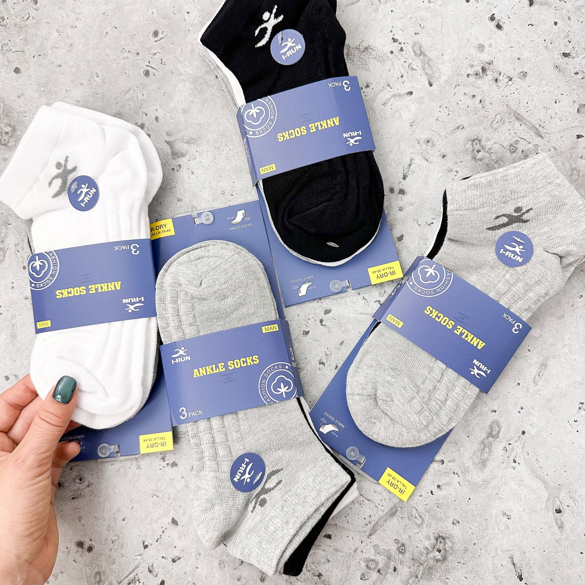 - Soquete de hombre marca I-Run. Colores en el pack: Blanco, negro y gris. Cubre talle 39 al 40 según etiqueta