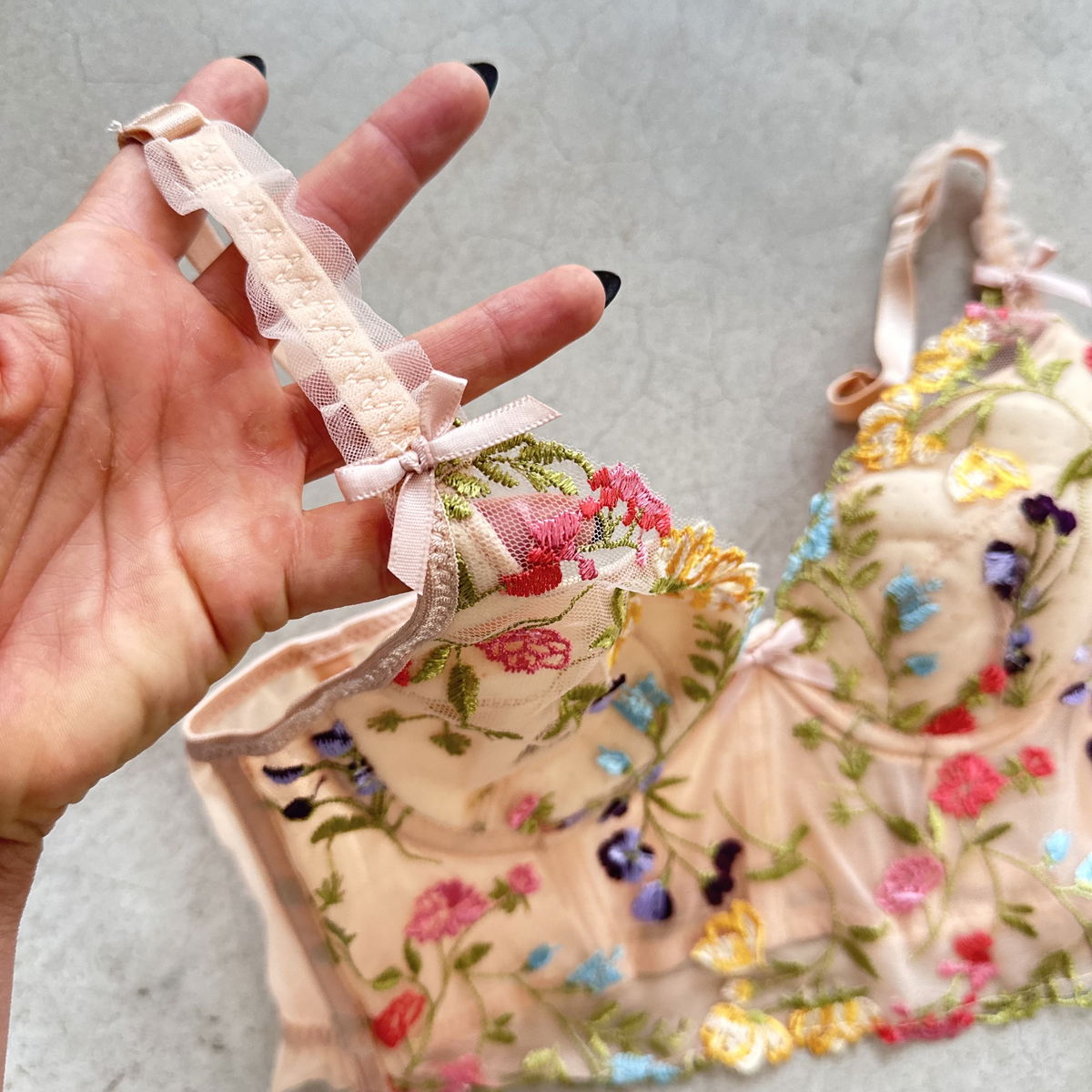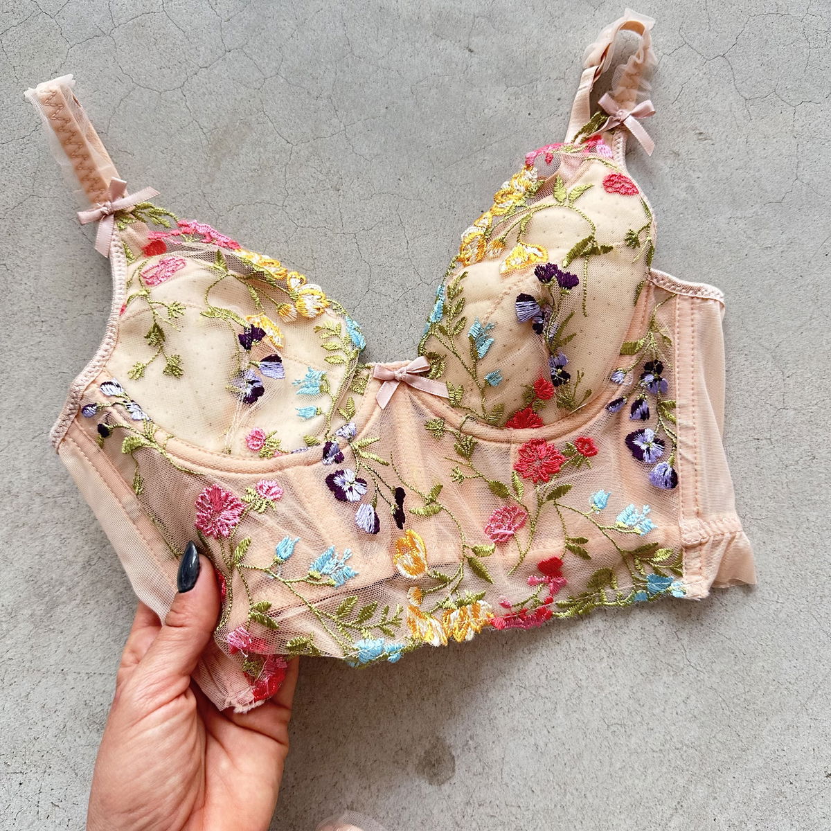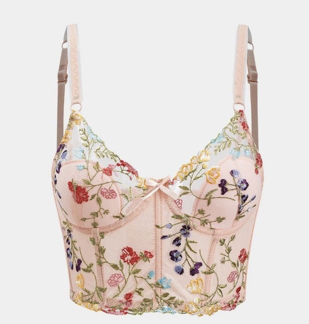 Corset de microtul, Importado bordado con destapes de volados en los breteles, regulables igual que el contorno. Con aro y varillas. 1/2 push. Talle S