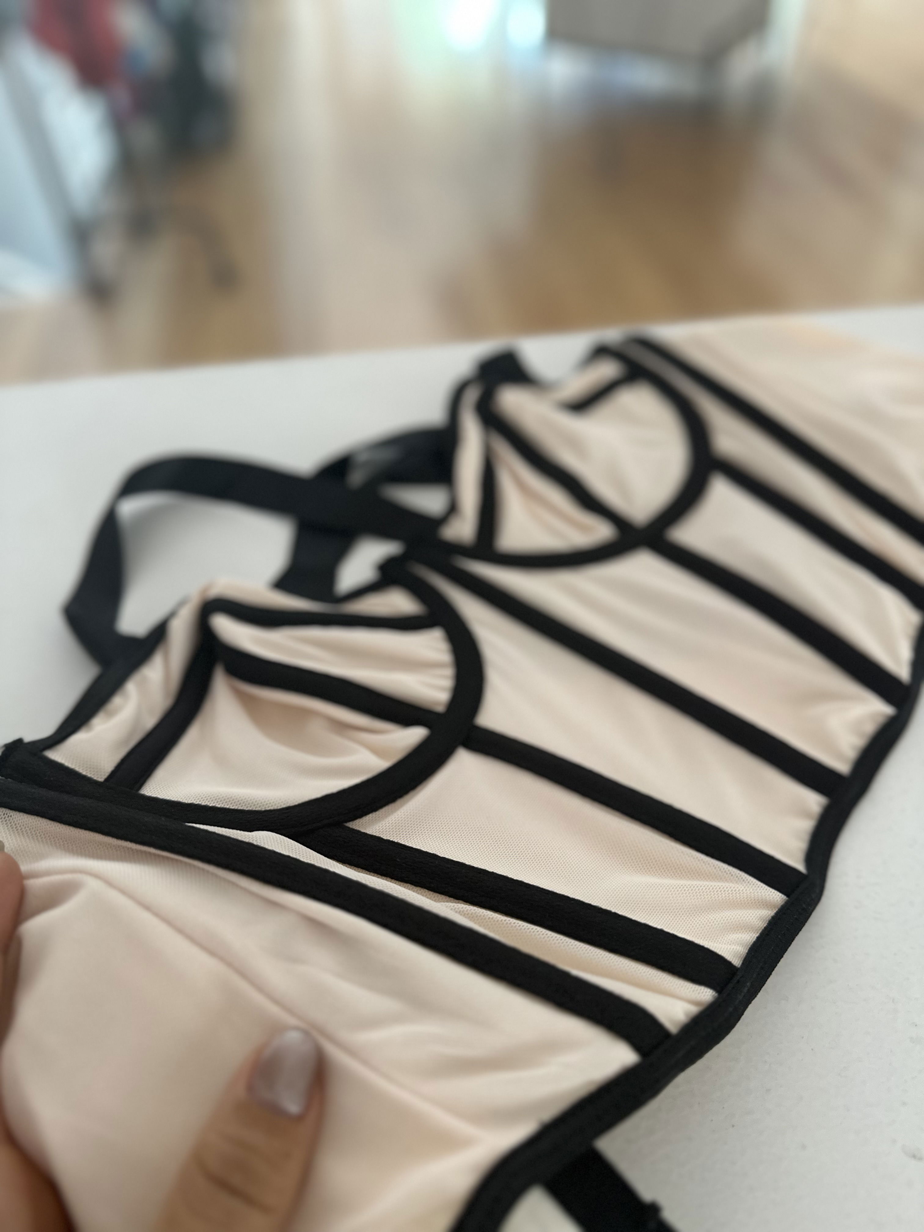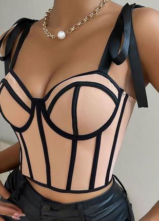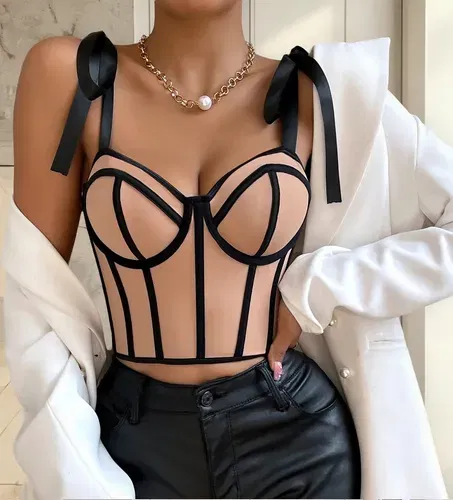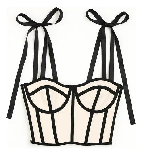 Top de tul con bretel de lazos, combinado color manteca y vivos negros