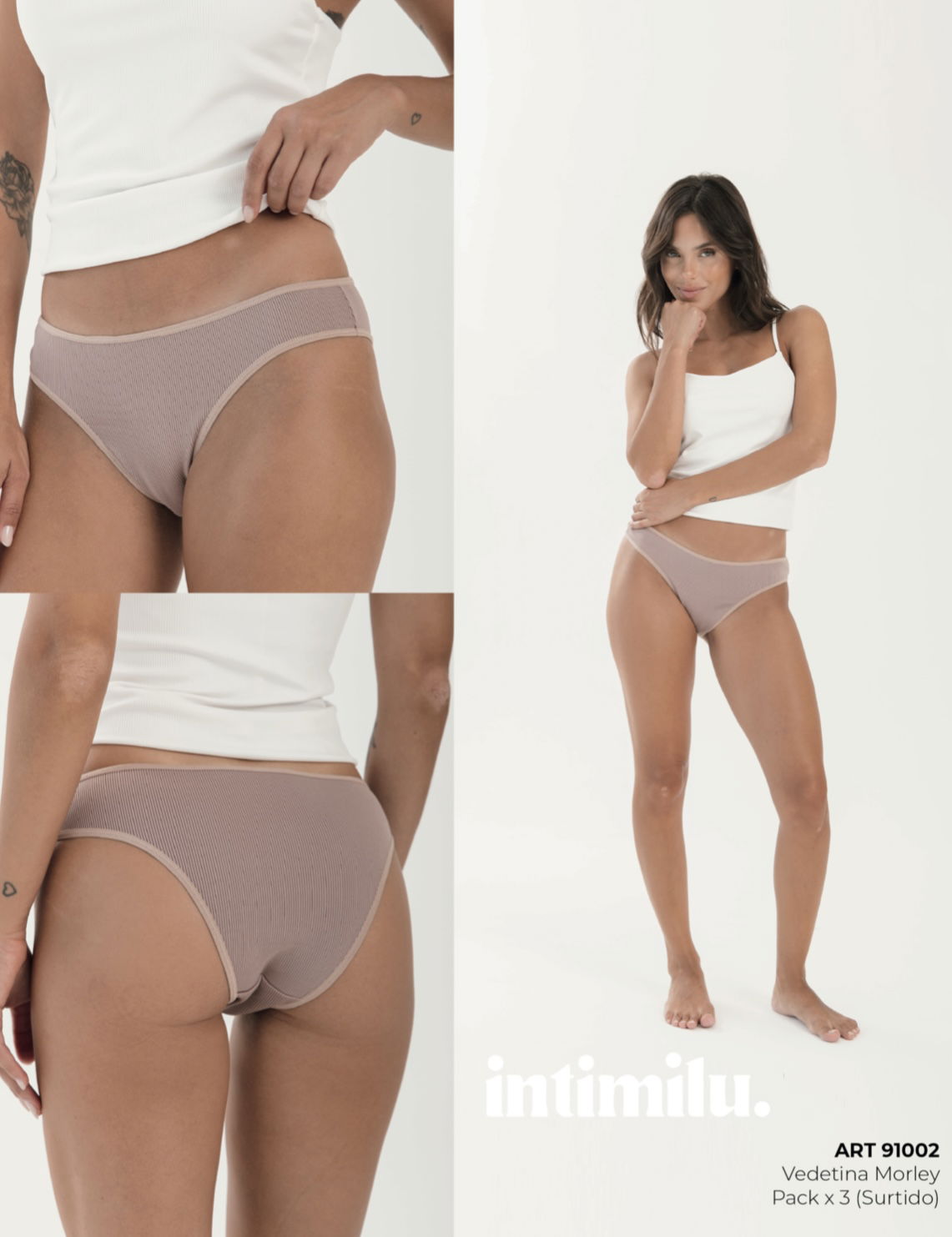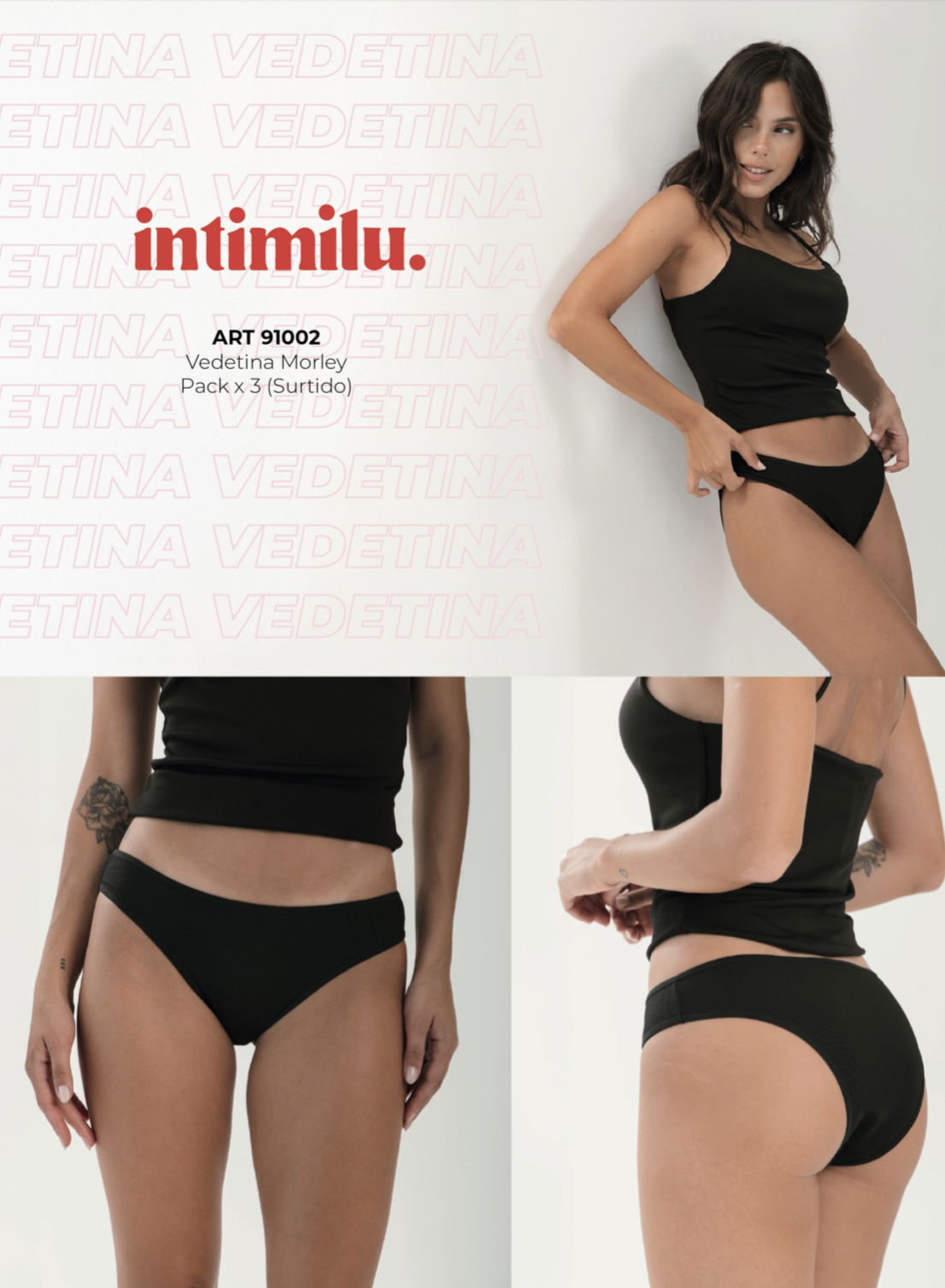 Vedettina lisa de morley y lycra . Colores en el pack: negro - blanco - natural . Incluye caja exhibidora