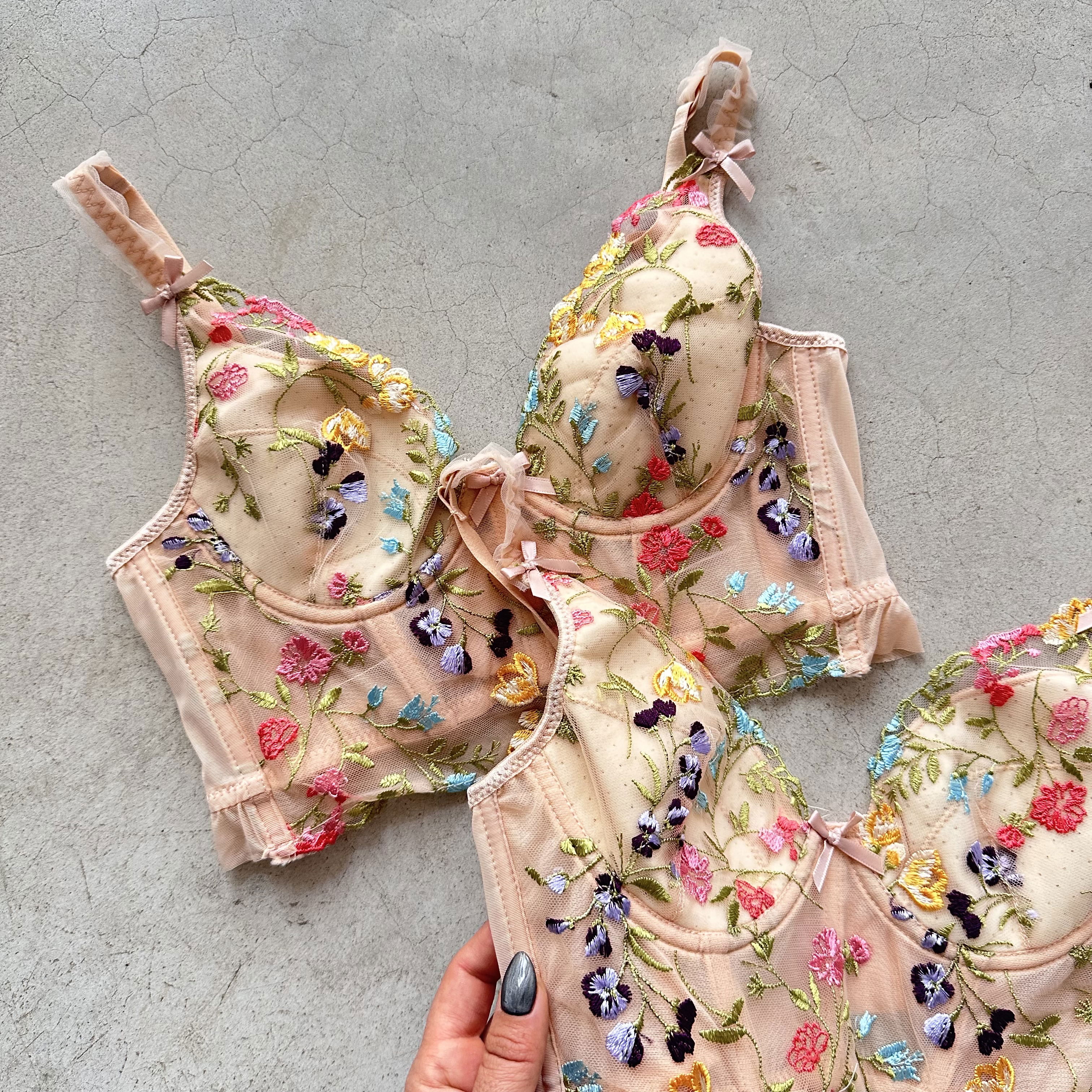 Corset de microtul, Importado bordado con destapes de volados en los breteles, regulables igual que el contorno. Con aro y varillas. 1/2 push. Talle S